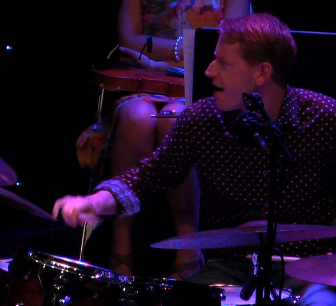 Shetland’s own multi-talented and versatile Maggie Adamson was one of four violinists, three viola players and one cello backing the quartet of Edmonstone on piano, Ruaridh Pattison on sax, Andrew Robb on bass and the brilliant Andrew Bain on drums who justified the price of the £8 ticket alone with his facial contortions!