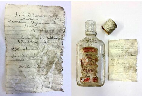 Found in a small bottle of Smirnoff vodka, it read: “J. T. T. Thomson. Mason. Muness, Uyeasound, Unst, Shetland. Inverness address 40 Denny St. Age 41. Finished building and tiling 20.6.67”