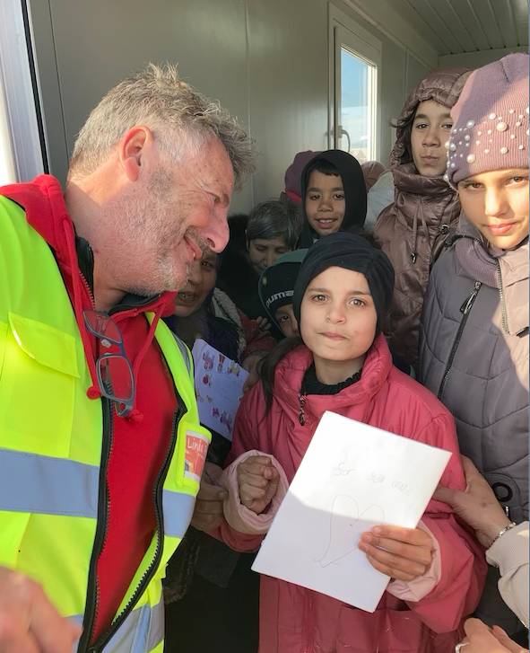 Stuart had made the run over with us, and I went to the van to ask if he had any chocolate for the bairns. No, he said, a bit embarrassed, but I’ve got this – and he pulled out this beautiful card his granddaughter had made, back in York. Covered in rainbows and drawings, and Ukrainian letters she’d carefully copied out from Google Translate.