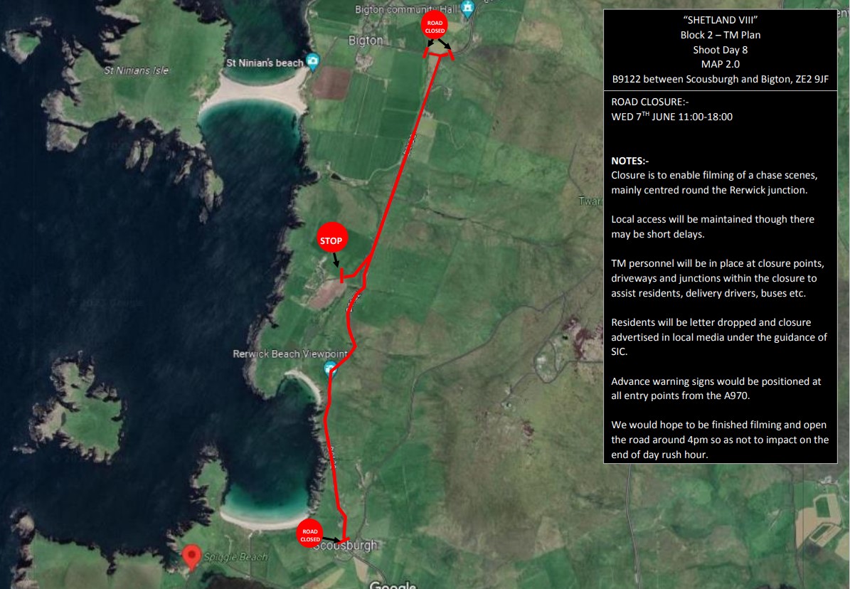 Temporary closures will be in place along the B9122 between the Bigton and Scousburgh junctions.