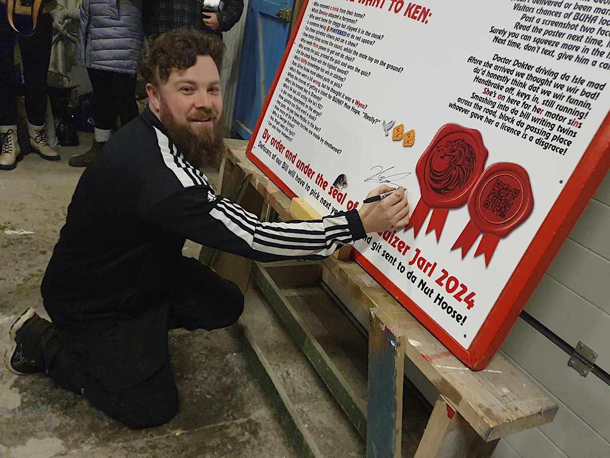 Leading the event this year is guizer jarl Laurence Robertson (32) – an ex-Bressay resident, now living in Lerwick with his partner Emma Riise and their two sons, Cole (13) and Levi (9), both of whom are in the squad with him, as is his father Jimmy and brother Jamie along with Jamie’s two sons Saul and Harper.