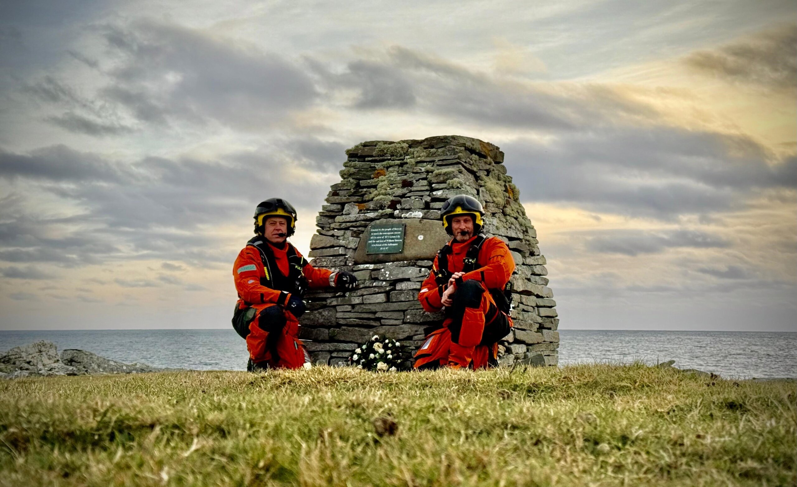 On Saturday members of the current Sumburgh-based coastguard crew – winch operator and deputy crew chief John Thomson and winch paramedic Ben Jacobs – flew to the cairn memorial for Deacon in Bressay to lay a wreath.
