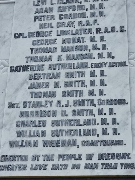 A somewhat unique name also included on the World War II memorial is that of Catherine Sutherland (known as Kitty), unique in the sense that she is the only female on the list of local casualties.