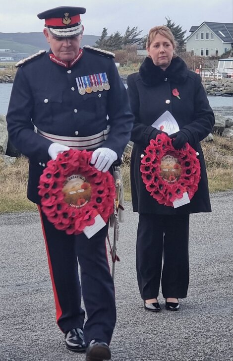 Following the short service, attended by a large group of islanders and held in unseasonal bright, calm conditions, two wreaths were laid at the site by Lord Lieutenant Lindsay Tulloch– a Bressay resident himself – followed by the emotive strains of the Last Post.