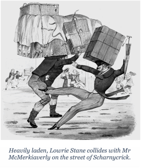 I was about to chastise my helpmeet in this vale of tears, for her frivolous attitude at what should be a time of pious contemplation of the Christmas Miracle and the making of solemn resolutions to repent and reform, when we heard the sound of Lowrie Stane, heavily laden, entering by the back door of the Manse.