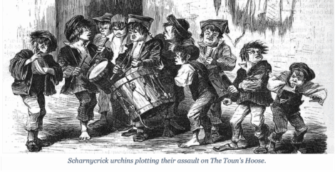 “Dat wull we,” responded the gallant Lowrie. Next morning at first light we set off over the shoulder of the Warty Hill, the boys bearing me in my newly repaired sedan chair to the Noost of Ancestors, where their frail bark had been laid up out of reach of winter storms. For a change, the day was fair and the sea calm, so we had an easy passage to the beach below the Toolbar tavern, whither Lowrie and Brucie repaired with some groats I had given them to purchase a refreshment after their arduous row. Sally was greeted by a gaggle of nieces and nephews, her sister being a resident of the town. Leaving her amid the garishly caparisoned stalls of the market traders, I made my way along the shore to the seat of municipal governance, where I beheld an extraordinary spectacle: for the noble edifice was besieged by a tumultuous crowd of urchins, blowing whistles, banging drums and crying “Sweeties! Sweeties! Wir waantin sweeties and wir waantin dem noo!”