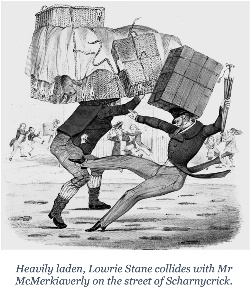 I was about to chastise my helpmeet in this vale of tears, for her frivolous attitude at what should be a time of pious contemplation of the Christmas Miracle and the making of solemn resolutions to repent and reform, when we heard the sound of Lowrie Stane, heavily laden, entering by the back door of the Manse.