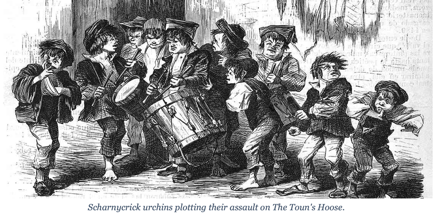 “Dat wull we,” responded the gallant Lowrie. Next morning at first light we set off over the shoulder of the Warty Hill, the boys bearing me in my newly repaired sedan chair to the Noost of Ancestors, where their frail bark had been laid up out of reach of winter storms. For a change, the day was fair and the sea calm, so we had an easy passage to the beach below the Toolbar tavern, whither Lowrie and Brucie repaired with some groats I had given them to purchase a refreshment after their arduous row. Sally was greeted by a gaggle of nieces and nephews, her sister being a resident of the town. Leaving her amid the garishly caparisoned stalls of the market traders, I made my way along the shore to the seat of municipal governance, where I beheld an extraordinary spectacle: for the noble edifice was besieged by a tumultuous crowd of urchins, blowing whistles, banging drums and crying “Sweeties! Sweeties! Wir waantin sweeties and wir waantin dem noo!”