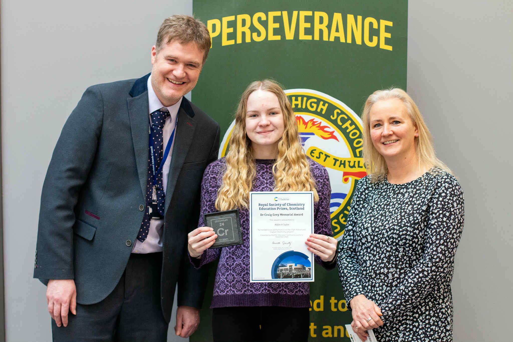 Abbie Taylor was given the Dr Craig Grey Memorial Award by the society for her exceptional performance in the SQA advanced higher chemistry project.