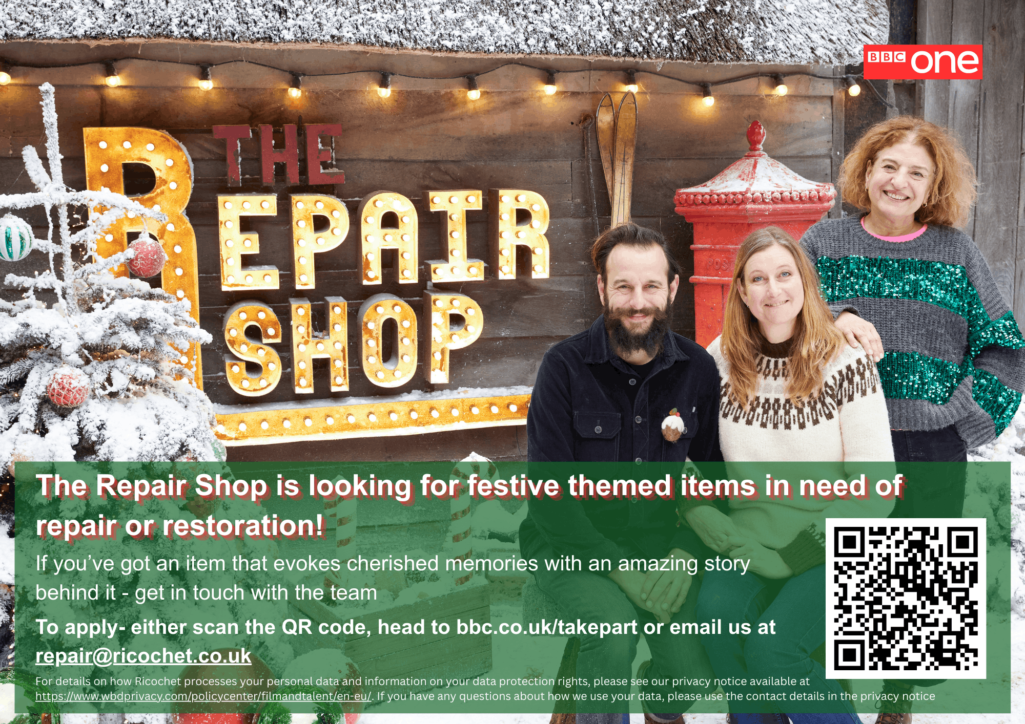 To apply head to bbc.co.uk/takepart or email the team at repair@ricochet.co.uk