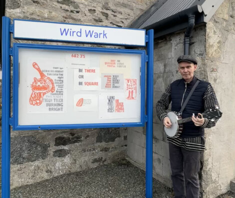 Created during weekly workshops at Toogs and printed in striking combinations of bold orange and black, Wird Wark draws on humorous phrases, memories and oxymorons Michael has heard throughout his years living and working in Shetland.