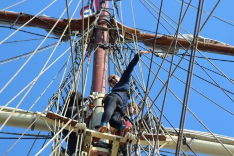 Trainees work under the guidance of the ship’s crew to learn a wide range of hands-on skills, such as watch-keeping, setting sails and other on-board domestic duties.