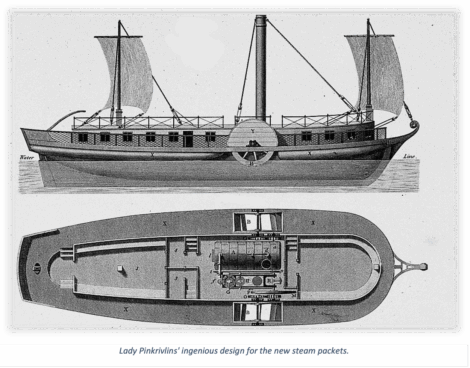 Asked her opinion of the plan to construct two new steam packets to carry His Majesty’s mails to Zetland, Lady Pinkrivlins commented: “I have been asking for this over so many years, ever since Mr Trevithick’s experiments with steam power in the mines. When I recently granted Mr McSwimmy an audience I confirmed that the proposal, albeit belated, still had my personal approval. I hoped he would show his appreciation and respect by naming the vessels St Emma and St Andrea. It is most disappointing that he did not immediately accede to this request, for I had been told I had his ear.”