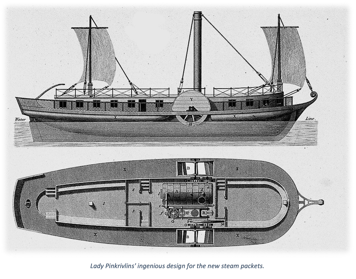 Asked her opinion of the plan to construct two new steam packets to carry His Majesty’s mails to Zetland, Lady Pinkrivlins commented: “I have been asking for this over so many years, ever since Mr Trevithick’s experiments with steam power in the mines. When I recently granted Mr McSwimmy an audience I confirmed that the proposal, albeit belated, still had my personal approval. I hoped he would show his appreciation and respect by naming the vessels St Emma and St Andrea. It is most disappointing that he did not immediately accede to this request, for I had been told I had his ear.”