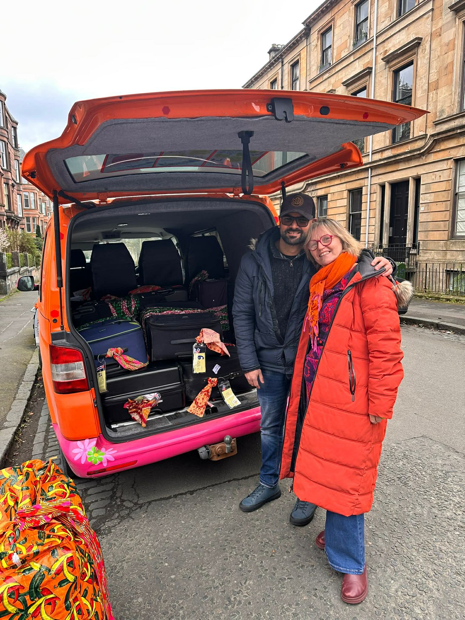She is on her way to London currently, with her distinct orange Volkswagen van stacked full with 22 suitcases.