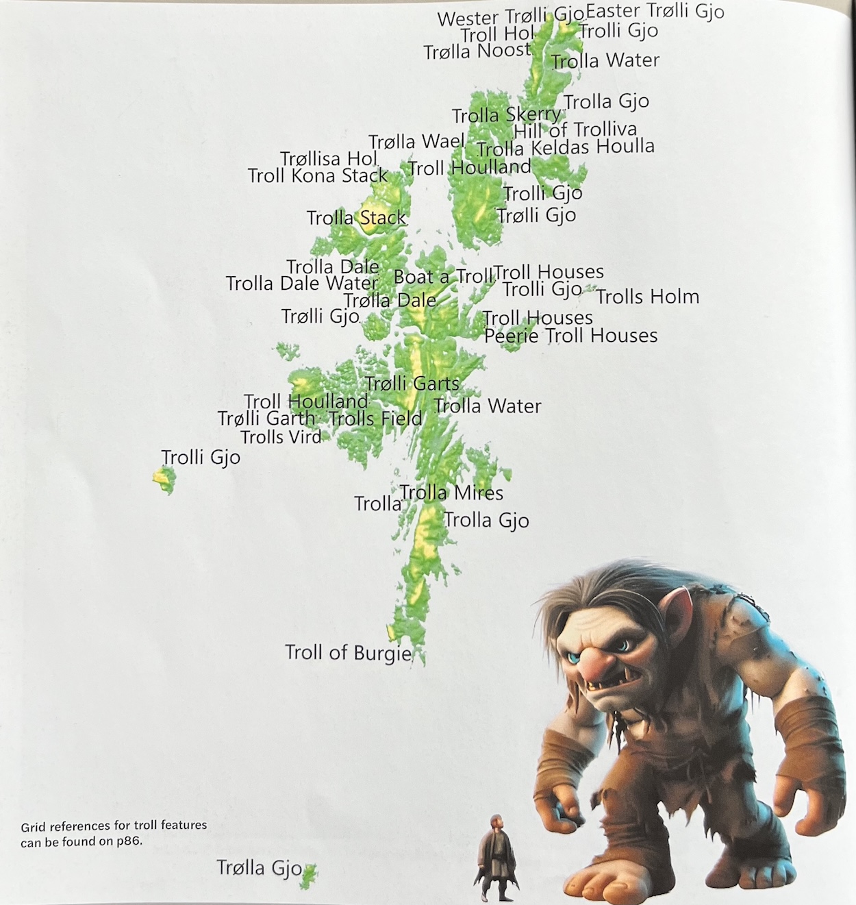 So far Paul has found evidence of 37 troll place names in Shetland, ranging from the far north of Unst to the far south in Fair Isle. Names such as Trolli Gjo are common from the old Norse word, Gjogv,which means geo or coastal ravine, and Trollisa Hol meaning the troll’s cave.