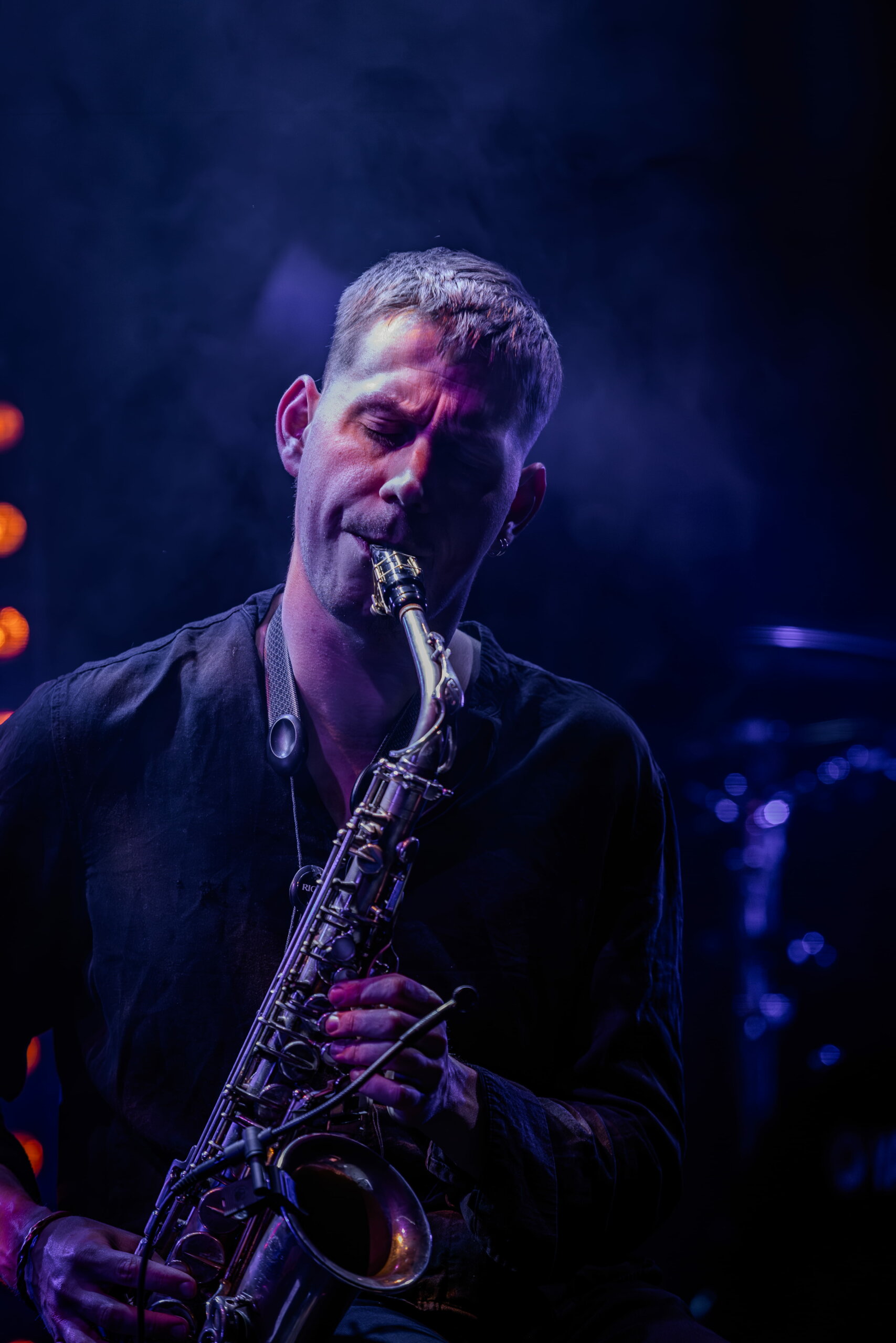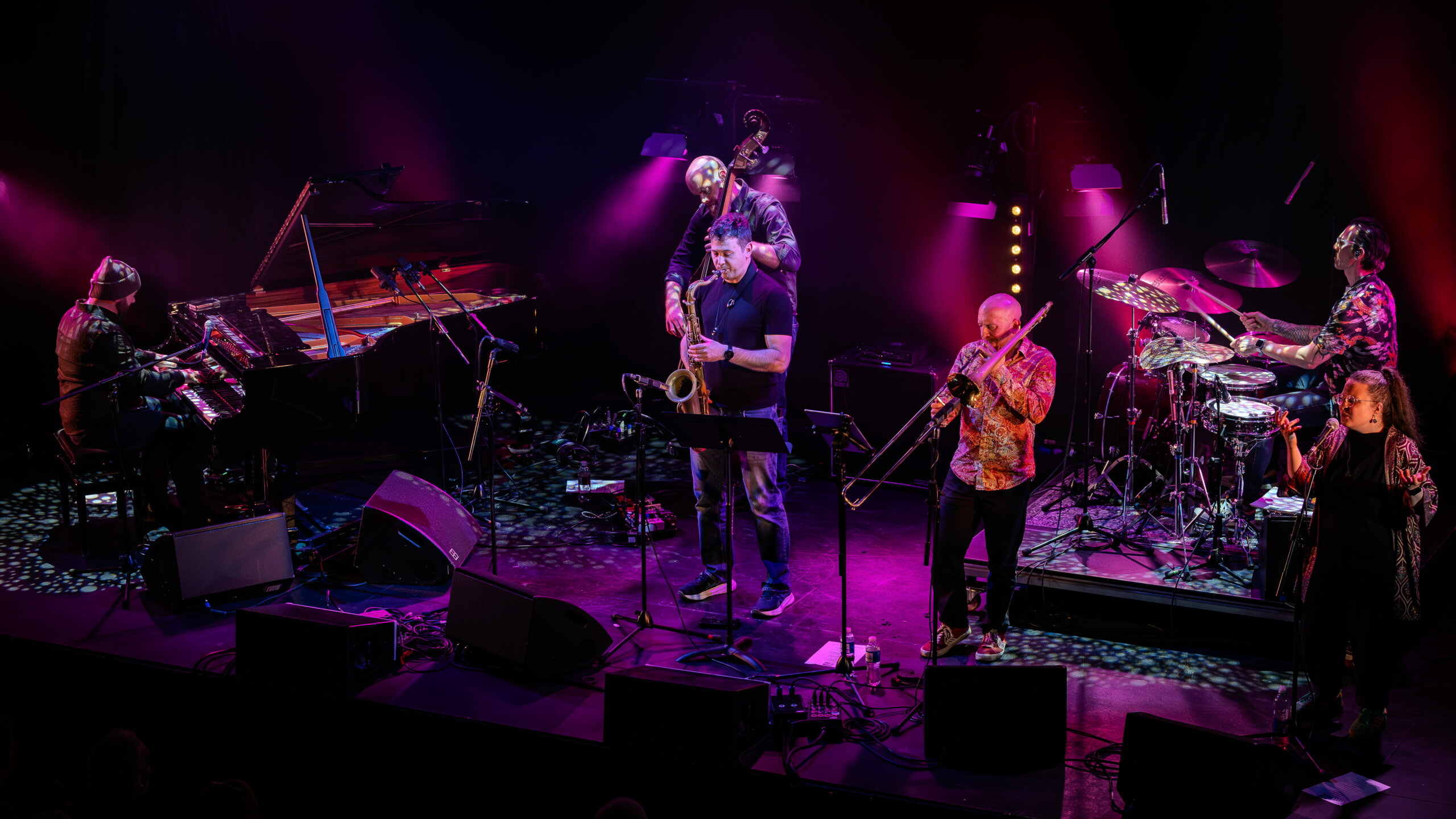 The soaring, swooping voice of Rachel Lightbody led us into Kamasi Washington territory, with sax virtuoso Konrad Wiszniewski leading the charge and stretching himself and his instrument’s boundaries with one solo after another. He looked somewhat familiar, reminding me of a night at Lerwick Town Hall back in the heyday of the Shetland Jazz Club. A little research showed me he did indeed play with Brass Jaw, brought north by Sandwick jazz impresario Jeff Merrifield many years ago.