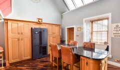 The lobby to the rear has doors to the kitchen, a lovely family bathroom, the second ground floor bedroom, and a stair up to the main sittingroom. A built-in cupboard provides storage. The breakfasting kitchen is a fabulous double height space, the substantial glazed area to the south-facing roof flooding the room and also the main sittingroom upstairs which overlooks it, with natural light, additional light coming from two south-facing windows both with window seats below. The room is attractively fitted with units which provide extensive cupboard and worktop space beautifully finished with cornices and other detailing. The four oven electric ‘AGA’ range (it also has two gas hobs) housed in a recess with tiled splash back is included in the sale along with the ‘American’ style fridgefreezer which also incorporates a wine chiller and is housed in a floor-to-ceiling run of fitted units to the wall opposite. A matching island breakfast bar unit with solid granite worktop provides additional storage. Also separate integral oven, concealed dishwasher and ‘Franke’ 1½ bowl sink.