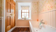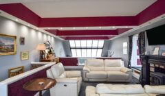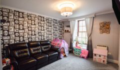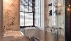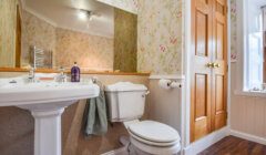 Back off the main hall, the carpeted main stair leads up to a first floor landing lit by an east-facing window overlooking the front garden, with doors to two large en-suite double bedrooms, and a handy built-in cupboard. Bedroom 3 to the right is a stylish, dual-aspect room with windows to the south and east, and a lovely en-suite with ‘metro’ style wet wall lined shower enclosure, and a ‘period’ style WC and wash hand basin with mirror with wall lights at either side, over. The chandelier light fitting in the bedroom will remain. The second first floor bedroom also benefits from the fine view east, and again, a beautifully decorated en-suite.
