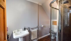 Next to the kitchen, is a family bathroom, attractively finished with painted paneling below a dado rail, the room including a white suite with double ended bath with centre mixer tap/shower fitting, plus a WC and wash hand basin with large wall mirror behind. The bath/shower rooms in the property generally have ‘period’ style fittings in keeping with the original style of the property, the showers mostly having ‘rainfall’ shower heads and separate hand held fittings. A built-in airing cupboard houses the central heating boiler and water tank. Next to the bathroom is a spacious, rear-facing, carpeted double bedroom with built-in wardrobe and a well-appointed en-suite with large shower, WC & wash hand basin, the arched window being an interesting feature.