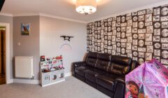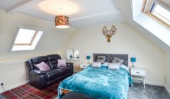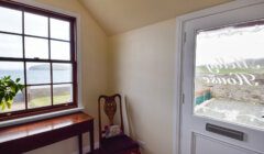 The stair up from the lobby outside the kitchen leads to the stunning main sittingroom which overlooks the kitchen, a very generously proportioned carpeted space, again with lots of natural light, as in addition to the large roof glazing over the kitchen, there is a substantial picture window with upholstered window seat below to the north which enjoys fantastic views to Papa Stour. The impressive fireplace surround houses a solid-fuel stove. Again like the main hall, the ceiling features recessed panels with perimeter spotlighting providing an abundance of artificial light.