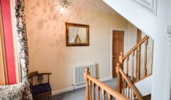 Solid oak doors from the hall lead to an east-facing double bedroom (bedroom 2) to the right, ahead to a lobby leading to the kitchen and another bedroom, and to the accommodation in the side extension to the left. A carpeted stair with oak bannister, and period style paneling below concealing a small under stairs cupboard, leads up to the first floor. The east-facing bedroom is lined out and plumbing and drainage connections are already in place allowing for the installation of an en-suite if required.