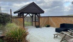 To the north side of the house is a greenhouse (approx. 3.5m x 3.15m (11’5” x 10’3”)), with power supply, a great space for a hot tub, a sheltered decked seating area with views to the sea, and a pergola leading to a large walled enclosure to the north.